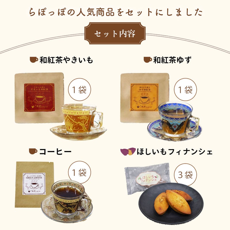 【ほしいもフィナンシェ】液卵白(国内製造)、バター、砂糖、さつまいも、小麦粉、アーモンドパウダー、はちみつ、さつまいもシロップ、バターオイル/水酸化Ca、(一部に小麦・卵・乳成分・アーモンドを含む) ◆注意喚起:はちみつを使用しておりますので、1歳未満の乳児には与えないでください。 【インスタントコーヒー】アラビカコーヒー(米国製造)、グリーンコーヒー豆抽出物 【やきいも和紅茶】紅茶(茨城県産)、やきいも(茨城県産)/香料 【和紅茶ゆず】紅茶(茨城県産)、ゆず(茨城県産)